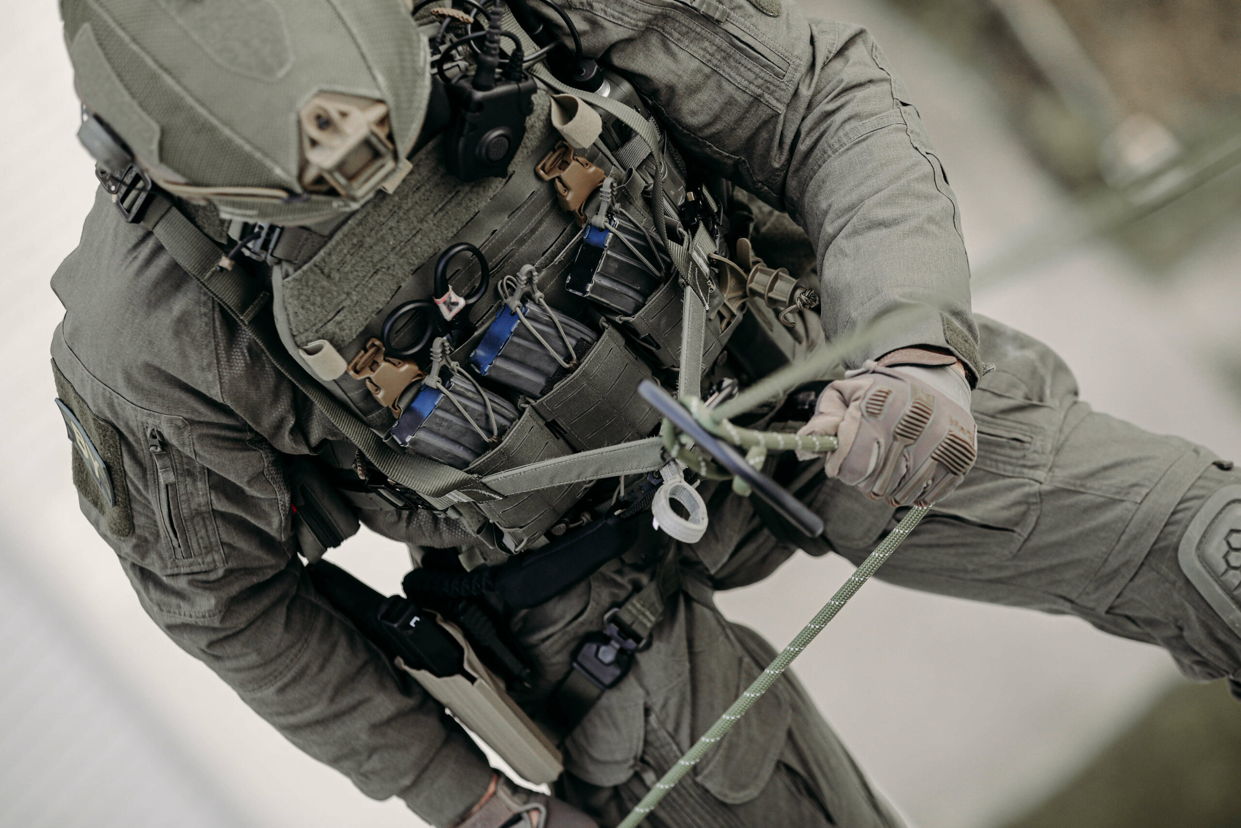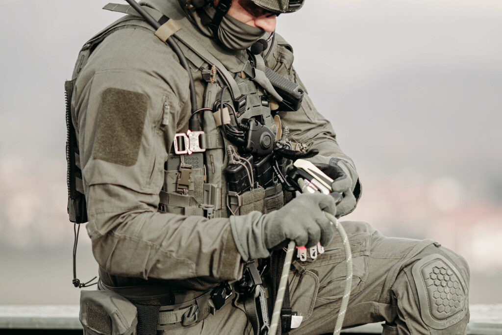 The Edelrid SE Quick-Drop chest harness offers seamless integration with existing plate carriers or protective vests, providing users with lightweight torso support and unrestricted access to equipment during rope operations.